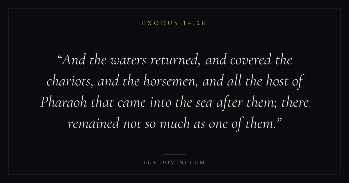 And the waters returned, and covered the chariots, and the horsemen, and all the host of Pharaoh that came into the sea after them; there remained not so much as one of them.