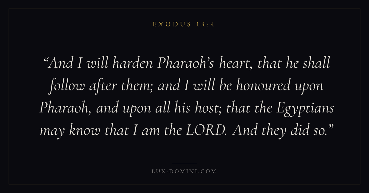 And I will harden Pharaoh’s heart, that he shall follow after them; and I will be honoured upon Pharaoh, and upon all his host; that the Egyptians may know that I am the LORD. And they did so.