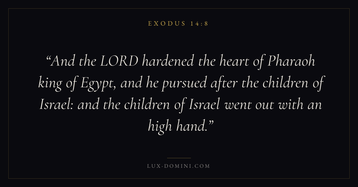 And the LORD hardened the heart of Pharaoh king of Egypt, and he pursued after the children of Israel: and the children of Israel went out with an high hand.