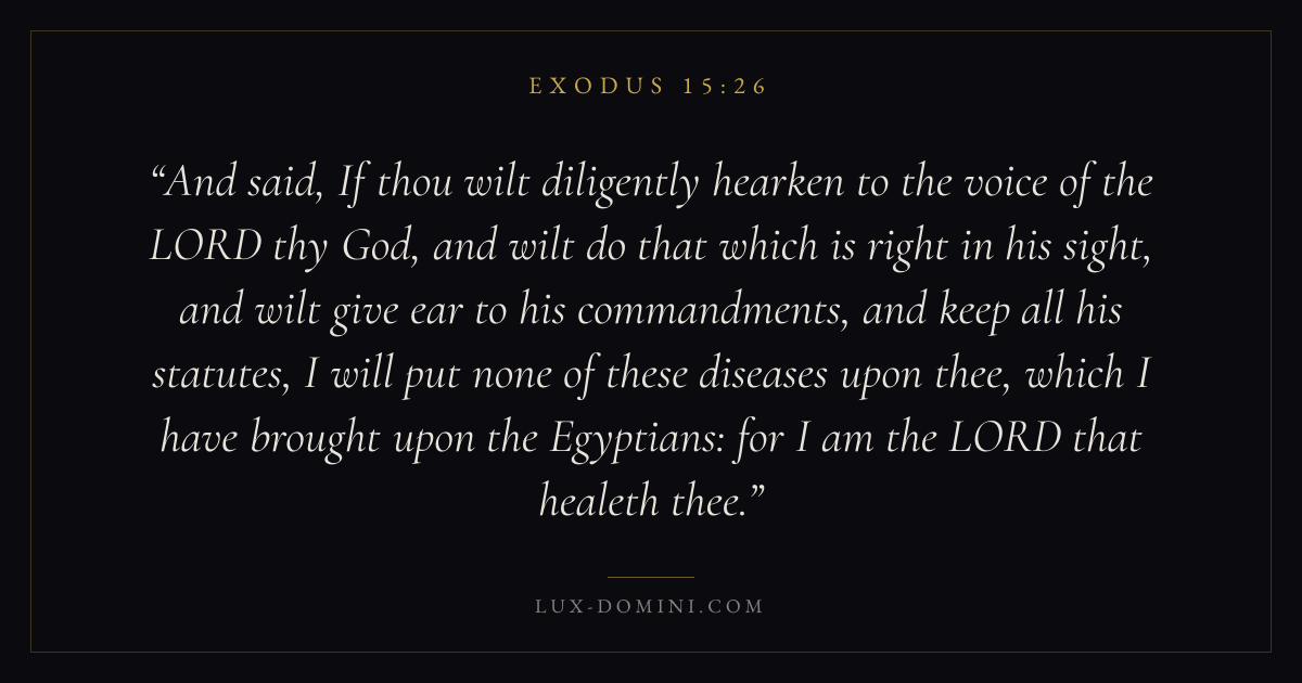 And said, If thou wilt diligently hearken to the voice of the LORD thy God, and wilt do that which is right in his sight, and wilt give ear to his commandments, and keep all his statutes, I will put none of these diseases upon thee, which I have brought upon the Egyptians: for I am the LORD that healeth thee.