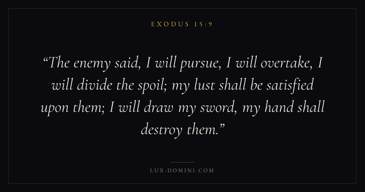 The enemy said, I will pursue, I will overtake, I will divide the spoil; my lust shall be satisfied upon them; I will draw my sword, my hand shall destroy them.