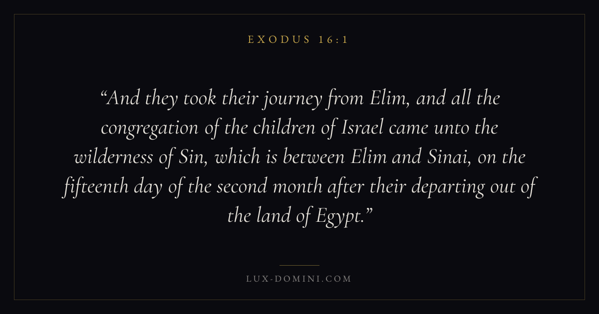 And they took their journey from Elim, and all the congregation of the children of Israel came unto the wilderness of Sin, which is between Elim and Sinai, on the fifteenth day of the second month after their departing out of the land of Egypt.