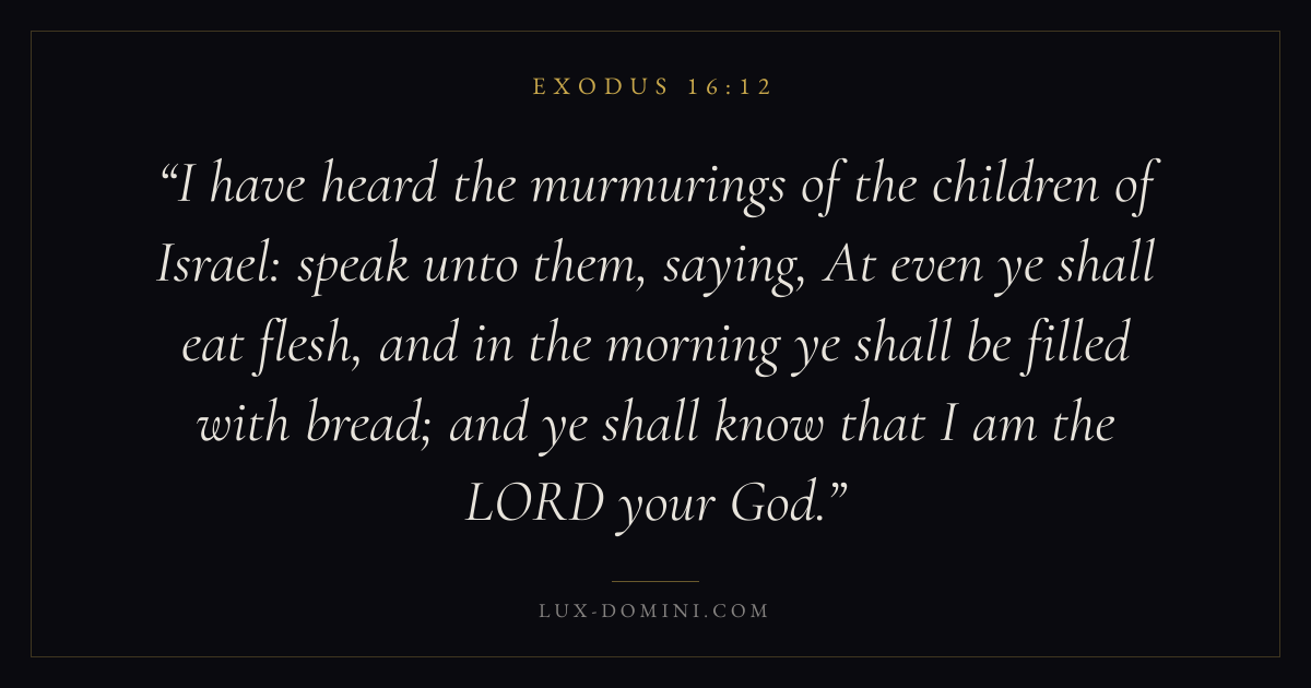I have heard the murmurings of the children of Israel: speak unto them, saying, At even ye shall eat flesh, and in the morning ye shall be filled with bread; and ye shall know that I am the LORD your God.