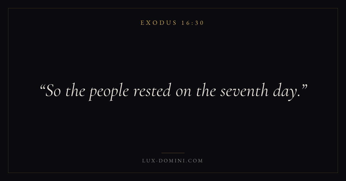 Books / Exodus / Chapter 16 / Verse 30 ← Exodus 16:29 Exodus 16:30 Exodus 16:31 → So the people rested on the seventh day. Download verse card Share on Twitter Share on Facebook Pin it ✦ Key themes SalvationRedemptionPassoverCovenant Read with Exodus 16:27Exodus 16:28John 3:16Ephesians 2:8 Related topics Bible verses about salvation ✦ Exodus Chapter 16 verses V. 1 V. 2 V. 3 V. 4 V. 5 V. 6 V. 7 V. 8 V. 9 V. 10 V. 11 V. 12 V. 13 V. 14 V. 15 V. 16 V. 17 V. 18 V. 19 V. 20 V. 21 V. 22 V. 23 V. 24 V. 25 V. 26 V. 27 V. 28 V. 29 V. 30 V. 31 V. 32 V. 33 V. 34 V. 35 V. 36