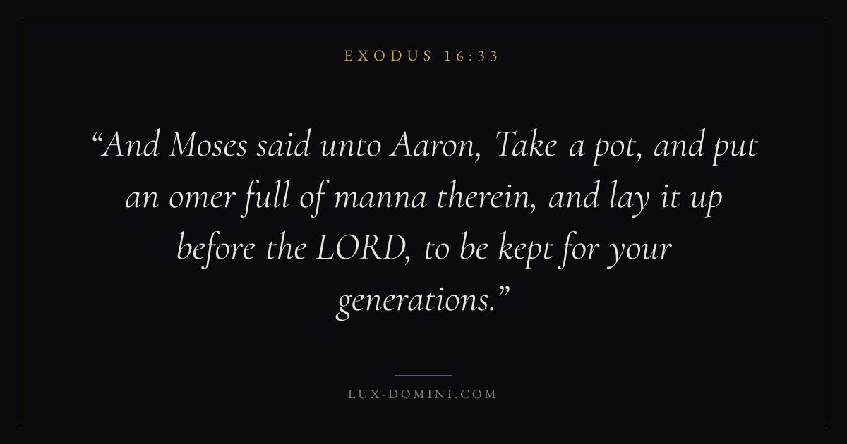 And Moses said unto Aaron, Take a pot, and put an omer full of manna therein, and lay it up before the LORD, to be kept for your generations.