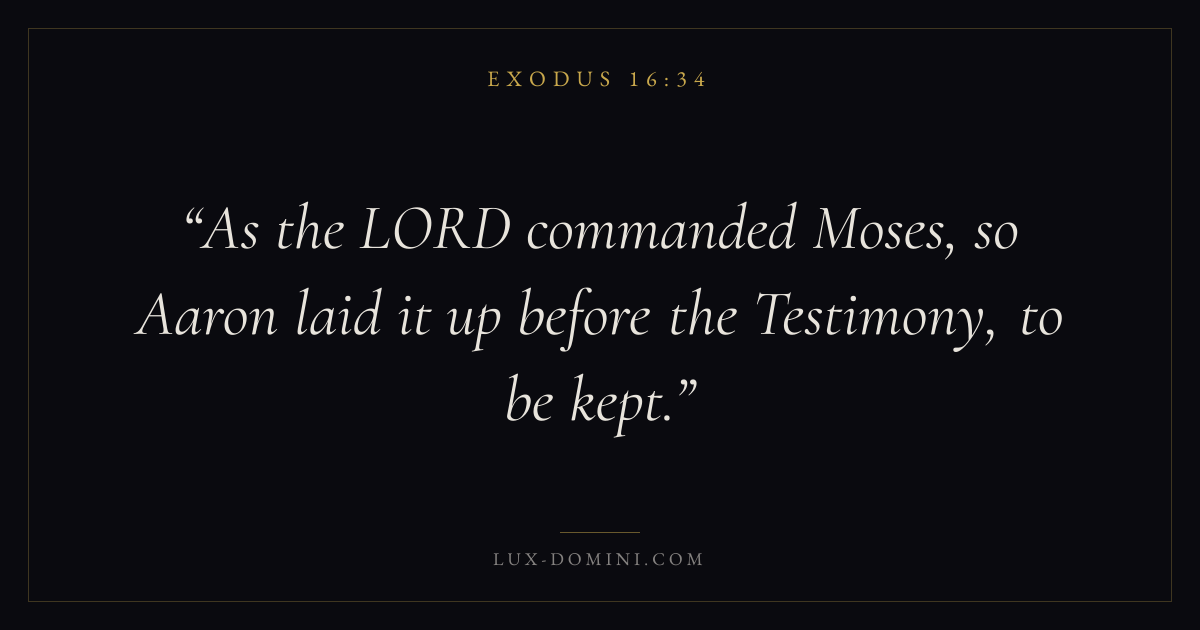 As the LORD commanded Moses, so Aaron laid it up before the Testimony, to be kept.
