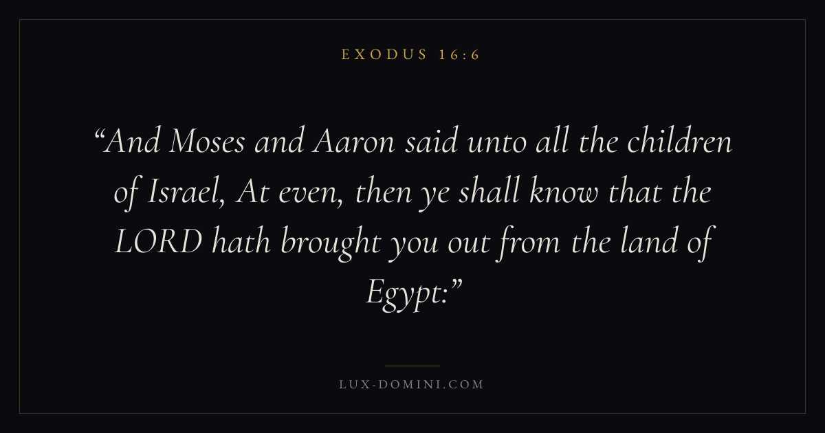 And Moses and Aaron said unto all the children of Israel, At even, then ye shall know that the LORD hath brought you out from the land of Egypt: