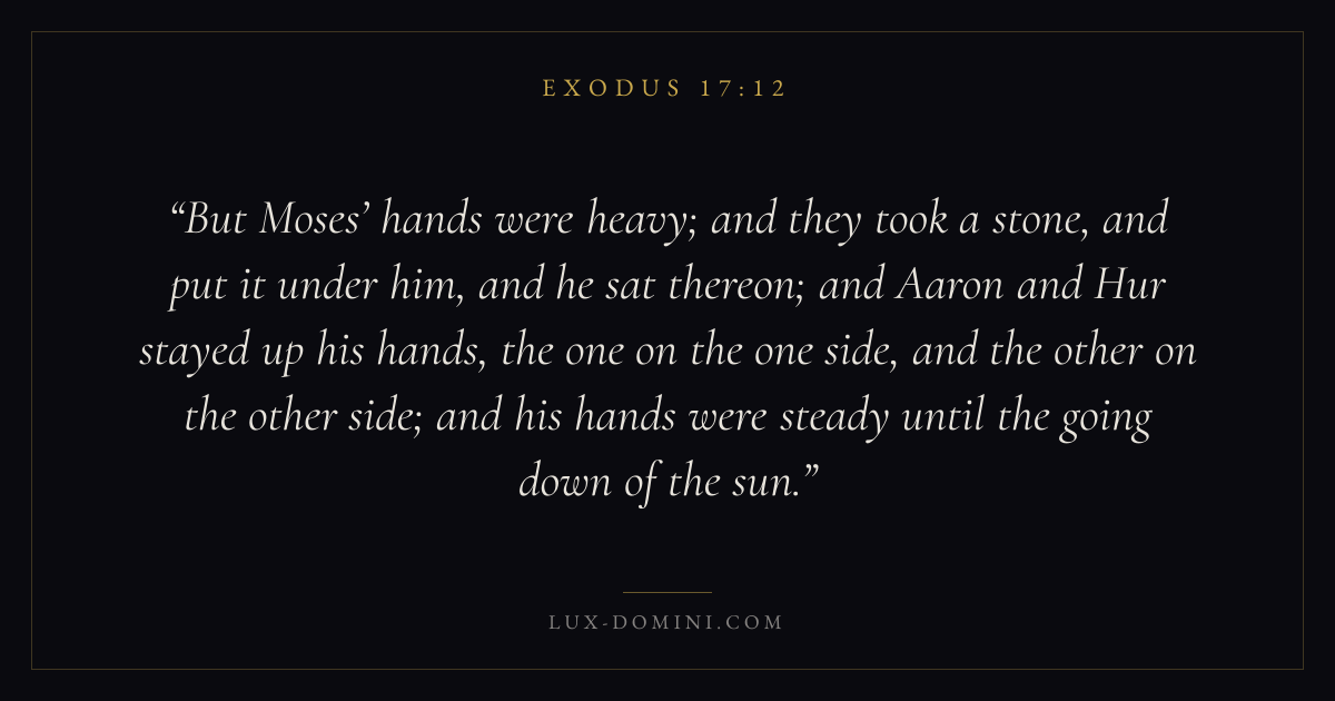 But Moses’ hands were heavy; and they took a stone, and put it under him, and he sat thereon; and Aaron and Hur stayed up his hands, the one on the one side, and the other on the other side; and his hands were steady until the going down of the sun.