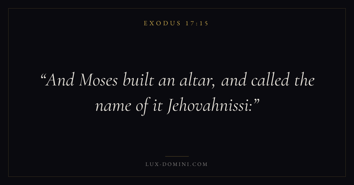 Books / Exodus / Chapter 17 / Verse 15 ← Exodus 17:14 Exodus 17:15 Exodus 17:16 → And Moses built an altar, and called the name of it Jehovahnissi: Download verse card Share on Twitter Share on Facebook Pin it ✦ Key themes SalvationRedemptionPassoverCovenant Read with Exodus 17:13Exodus 17:14John 3:16Ephesians 2:8 Related topics Bible verses about salvation ✦ Exodus Chapter 17 verses V. 1 V. 2 V. 3 V. 4 V. 5 V. 6 V. 7 V. 8 V. 9 V. 10 V. 11 V. 12 V. 13 V. 14 V. 15 V. 16