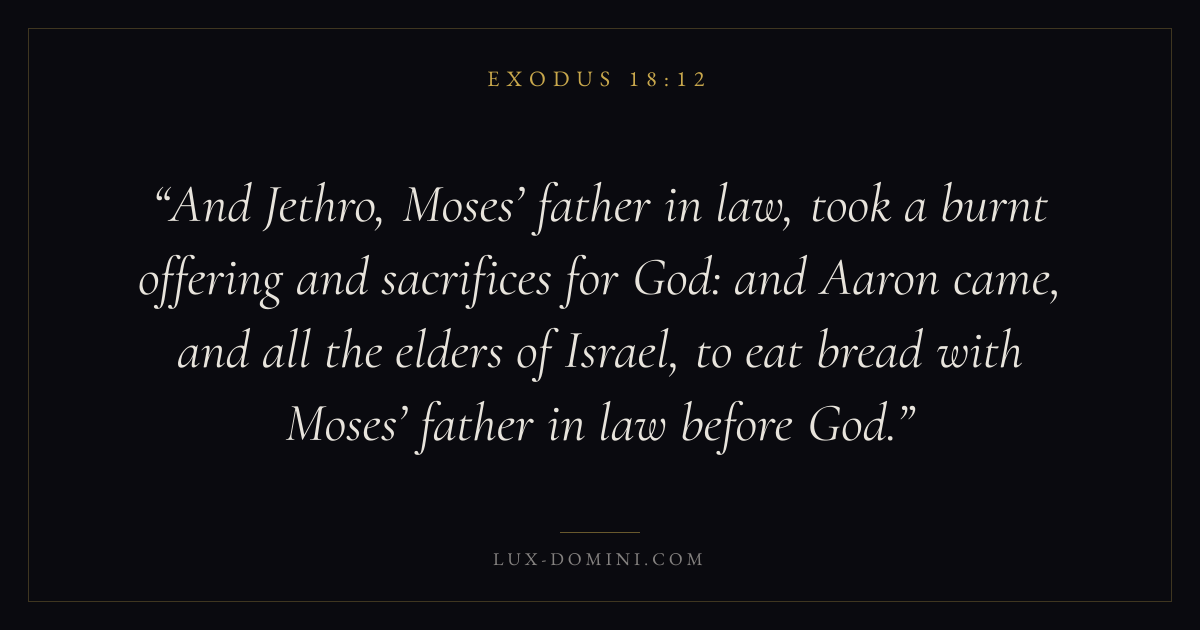 And Jethro, Moses’ father in law, took a burnt offering and sacrifices for God: and Aaron came, and all the elders of Israel, to eat bread with Moses’ father in law before God.