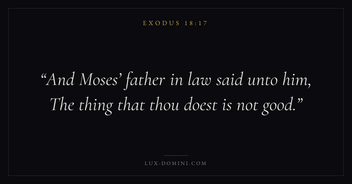 Books / Exodus / Chapter 18 / Verse 17 ← Exodus 18:16 Exodus 18:17 Exodus 18:18 → And Moses’ father in law said unto him, The thing that thou doest is not good. Download verse card Share on Twitter Share on Facebook Pin it ✦ Key themes Justice and mercySalvationRedemptionPassover Read with Exodus 18:13Exodus 18:14Micah 6:8Amos 5:24 Related topics Bible verses about justice and mercyBible verses about salvation ✦ Exodus Chapter 18 verses V. 1 V. 2 V. 3 V. 4 V. 5 V. 6 V. 7 V. 8 V. 9 V. 10 V. 11 V. 12 V. 13 V. 14 V. 15 V. 16 V. 17 V. 18 V. 19 V. 20 V. 21 V. 22 V. 23 V. 24 V. 25 V. 26 V. 27