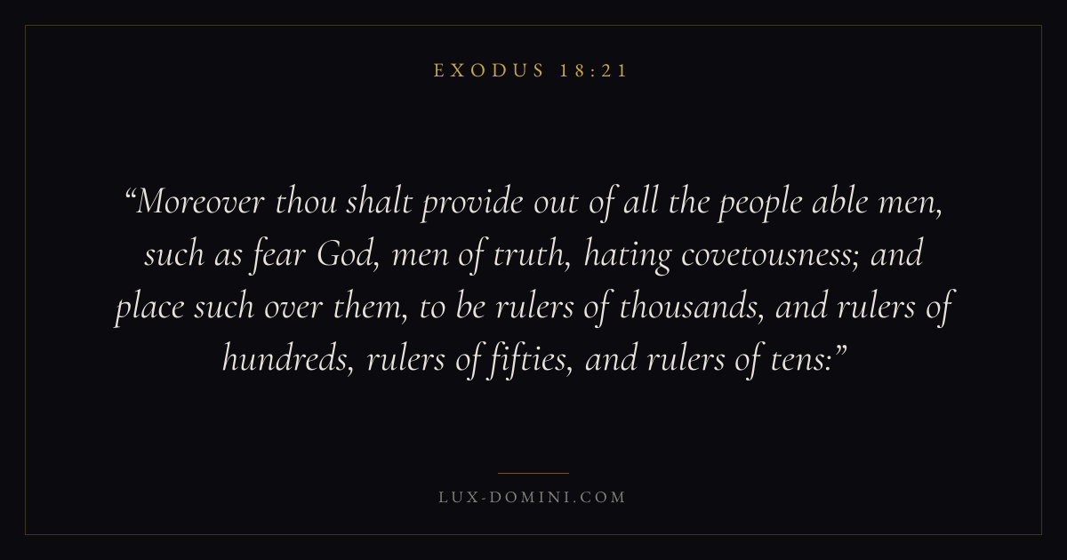 Moreover thou shalt provide out of all the people able men, such as fear God, men of truth, hating covetousness; and place such over them, to be rulers of thousands, and rulers of hundreds, rulers of fifties, and rulers of tens: