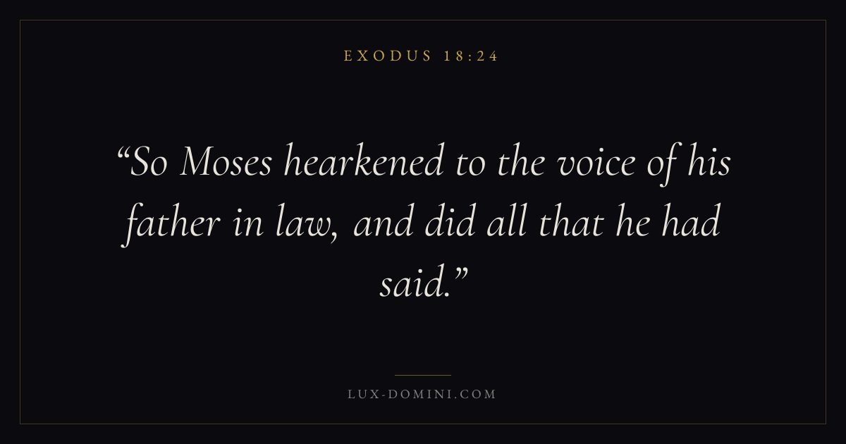 Books / Exodus / Chapter 18 / Verse 24 ← Exodus 18:23 Exodus 18:24 Exodus 18:25 → So Moses hearkened to the voice of his father in law, and did all that he had said. Download verse card Share on Twitter Share on Facebook Pin it ✦ Key themes Justice and mercySalvationRedemptionPassover Read with Exodus 18:23Exodus 18:25Micah 6:8Amos 5:24 Related topics Bible verses about justice and mercyBible verses about salvation ✦ Exodus Chapter 18 verses V. 1 V. 2 V. 3 V. 4 V. 5 V. 6 V. 7 V. 8 V. 9 V. 10 V. 11 V. 12 V. 13 V. 14 V. 15 V. 16 V. 17 V. 18 V. 19 V. 20 V. 21 V. 22 V. 23 V. 24 V. 25 V. 26 V. 27