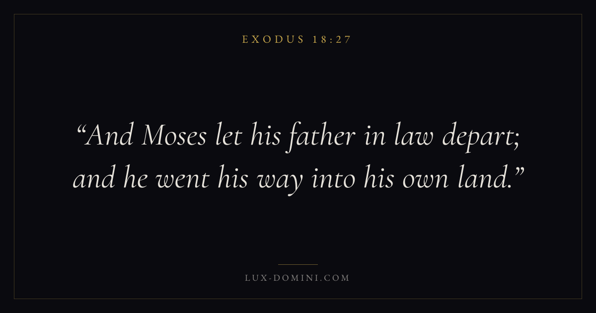 Books / Exodus / Chapter 18 / Verse 27 ← Exodus 18:26 Exodus 18:27 Exodus 19:1 → And Moses let his father in law depart; and he went his way into his own land. Download verse card Share on Twitter Share on Facebook Pin it ✦ Key themes Justice and mercySalvationRedemptionPassover Read with Micah 6:8Amos 5:24John 3:16Ephesians 2:8 Related topics Bible verses about justice and mercyBible verses about salvation ✦ Exodus Chapter 18 verses V. 1 V. 2 V. 3 V. 4 V. 5 V. 6 V. 7 V. 8 V. 9 V. 10 V. 11 V. 12 V. 13 V. 14 V. 15 V. 16 V. 17 V. 18 V. 19 V. 20 V. 21 V. 22 V. 23 V. 24 V. 25 V. 26 V. 27