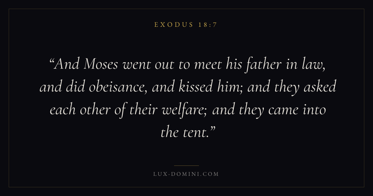 And Moses went out to meet his father in law, and did obeisance, and kissed him; and they asked each other of their welfare; and they came into the tent.