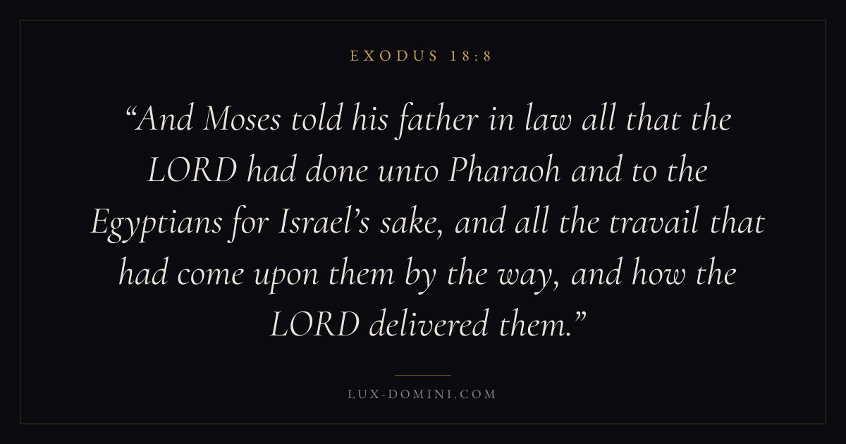 And Moses told his father in law all that the LORD had done unto Pharaoh and to the Egyptians for Israel’s sake, and all the travail that had come upon them by the way, and how the LORD delivered them.