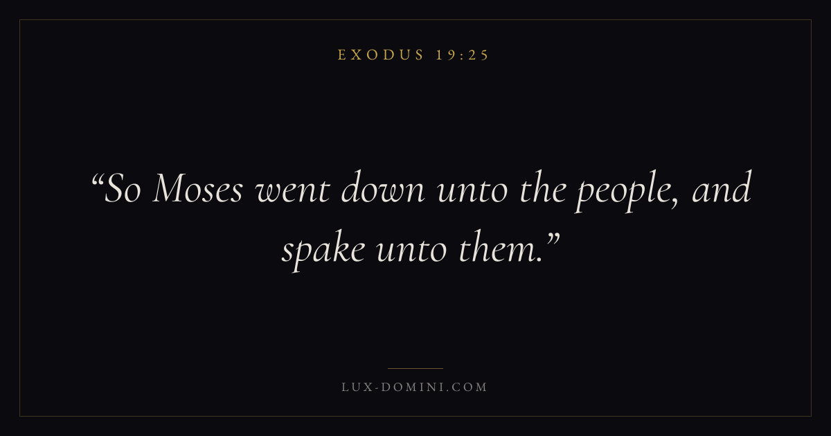 Books / Exodus / Chapter 19 / Verse 25 ← Exodus 19:24 Exodus 19:25 Exodus 20:1 → So Moses went down unto the people, and spake unto them. Download verse card Share on Twitter Share on Facebook Pin it ✦ Key themes SalvationRedemptionPassoverCovenant Read with Exodus 19:21Exodus 19:22John 3:16Ephesians 2:8 Related topics Bible verses about salvation ✦ Exodus Chapter 19 verses V. 1 V. 2 V. 3 V. 4 V. 5 V. 6 V. 7 V. 8 V. 9 V. 10 V. 11 V. 12 V. 13 V. 14 V. 15 V. 16 V. 17 V. 18 V. 19 V. 20 V. 21 V. 22 V. 23 V. 24 V. 25