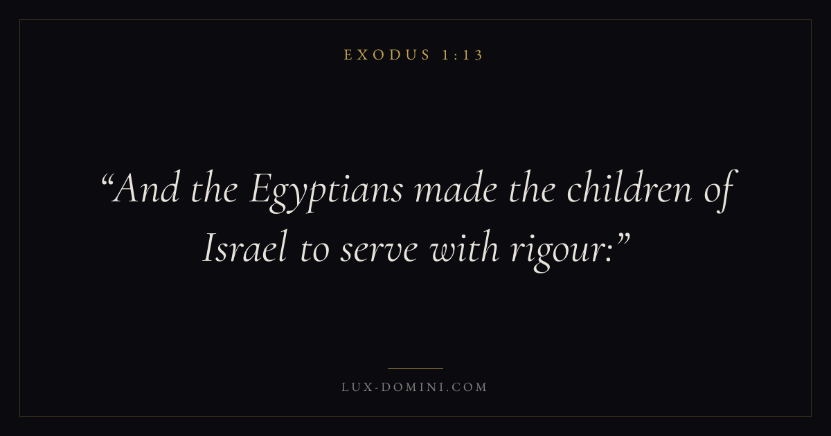 Books / Exodus / Chapter 1 / Verse 13 ← Exodus 1:12 Exodus 1:13 Exodus 1:14 → And the Egyptians made the children of Israel to serve with rigour: Download verse card Share on Twitter Share on Facebook Pin it ✦ Key themes Suffering and trialsSalvationRedemptionPassover Read with Exodus 1:14Romans 8:182 Corinthians 4:17John 3:16 Related topics Bible verses about suffering and trialsBible verses about salvation ✦ Exodus Chapter 1 verses V. 1 V. 2 V. 3 V. 4 V. 5 V. 6 V. 7 V. 8 V. 9 V. 10 V. 11 V. 12 V. 13 V. 14 V. 15 V. 16 V. 17 V. 18 V. 19 V. 20 V. 21 V. 22