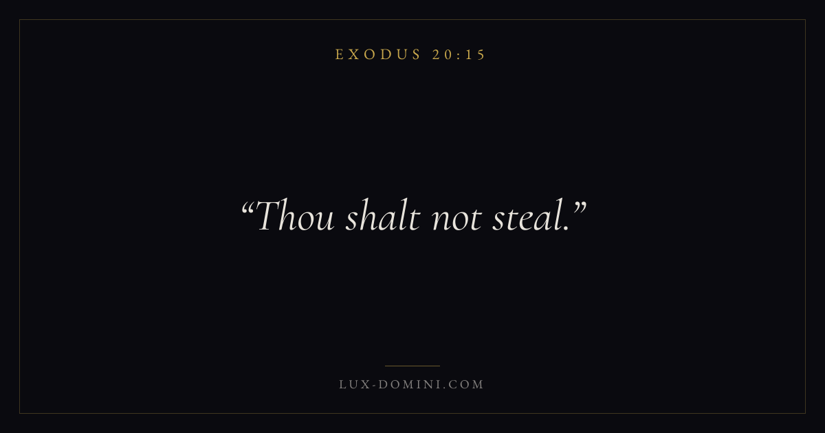 Books / Exodus / Chapter 20 / Verse 15 ← Exodus 20:14 Exodus 20:15 Exodus 20:16 → Thou shalt not steal. Download verse card Share on Twitter Share on Facebook Pin it ✦ Key themes LoveSalvationRedemptionPassover Read with Exodus 20:14John 3:161 Corinthians 13:4Ephesians 2:8 Related topics Bible verses about loveBible verses about salvation ✦ Exodus Chapter 20 verses V. 1 V. 2 V. 3 V. 4 V. 5 V. 6 V. 7 V. 8 V. 9 V. 10 V. 11 V. 12 V. 13 V. 14 V. 15 V. 16 V. 17 V. 18 V. 19 V. 20 V. 21 V. 22 V. 23 V. 24 V. 25 V. 26