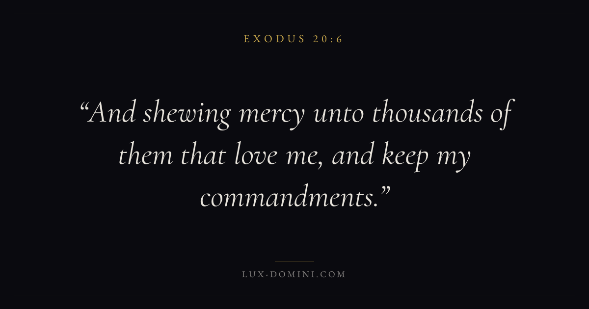 Books / Exodus / Chapter 20 / Verse 6 ← Exodus 20:5 Exodus 20:6 Exodus 20:7 → And shewing mercy unto thousands of them that love me, and keep my commandments. Download verse card Share on Twitter Share on Facebook Pin it ✦ Key themes LoveJustice and mercySalvationRedemption Read with Exodus 20:4Exodus 20:5John 3:161 Corinthians 13:4 Related topics Bible verses about loveBible verses about justice and mercyBible verses about salvation ✦ Exodus Chapter 20 verses V. 1 V. 2 V. 3 V. 4 V. 5 V. 6 V. 7 V. 8 V. 9 V. 10 V. 11 V. 12 V. 13 V. 14 V. 15 V. 16 V. 17 V. 18 V. 19 V. 20 V. 21 V. 22 V. 23 V. 24 V. 25 V. 26