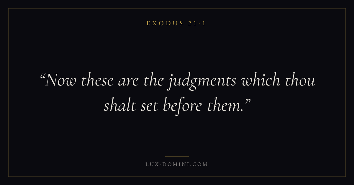 Books / Exodus / Chapter 21 / Verse 1 ← Exodus 20:26 Exodus 21:1 Exodus 21:2 → Now these are the judgments which thou shalt set before them. Download verse card Share on Twitter Share on Facebook Pin it ✦ Key themes Justice and mercySalvationRedemptionPassover Read with Exodus 21:2Exodus 21:3Micah 6:8Amos 5:24 Related topics Bible verses about justice and mercyBible verses about salvation ✦ Exodus Chapter 21 verses V. 1 V. 2 V. 3 V. 4 V. 5 V. 6 V. 7 V. 8 V. 9 V. 10 V. 11 V. 12 V. 13 V. 14 V. 15 V. 16 V. 17 V. 18 V. 19 V. 20 V. 21 V. 22 V. 23 V. 24 V. 25 V. 26 V. 27 V. 28 V. 29 V. 30 V. 31 V. 32 V. 33 V. 34 V. 35 V. 36