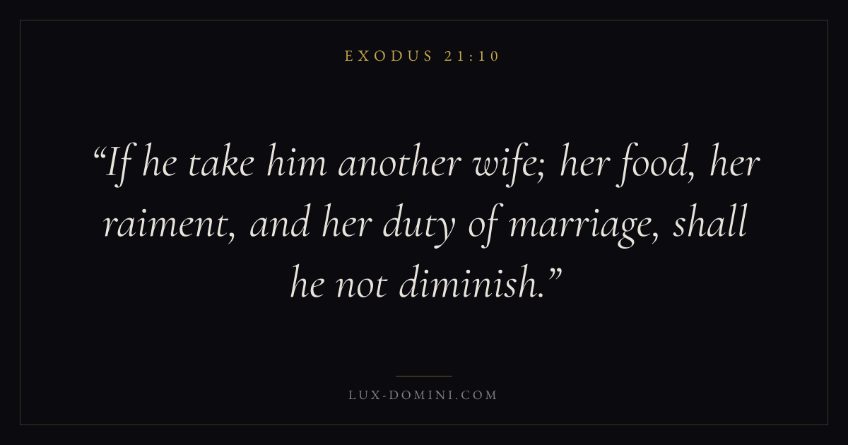 If he take him another wife; her food, her raiment, and her duty of marriage, shall he not diminish.
