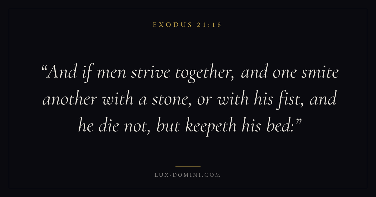 And if men strive together, and one smite another with a stone, or with his fist, and he die not, but keepeth his bed: