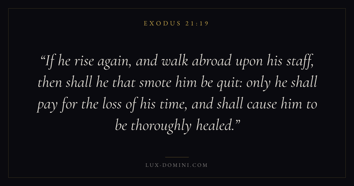If he rise again, and walk abroad upon his staff, then shall he that smote him be quit: only he shall pay for the loss of his time, and shall cause him to be thoroughly healed.