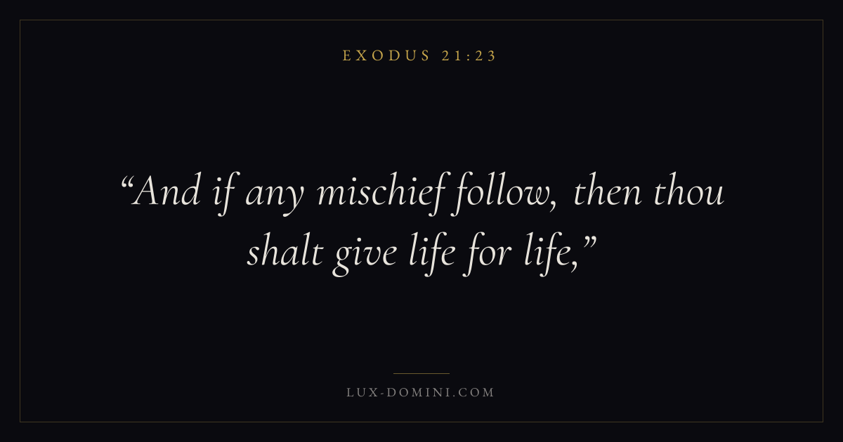 Books / Exodus / Chapter 21 / Verse 23 ← Exodus 21:22 Exodus 21:23 Exodus 21:24 → And if any mischief follow, then thou shalt give life for life, Download verse card Share on Twitter Share on Facebook Pin it ✦ Key themes Anxiety and fearJustice and mercySalvationPeaceRedemption Read with Exodus 21:22Exodus 21:24Philippians 4:6Isaiah 41:10 Related topics Bible verses about anxiety and fearBible verses about justice and mercyBible verses about salvationBible verses about peace ✦ Exodus Chapter 21 verses V. 1 V. 2 V. 3 V. 4 V. 5 V. 6 V. 7 V. 8 V. 9 V. 10 V. 11 V. 12 V. 13 V. 14 V. 15 V. 16 V. 17 V. 18 V. 19 V. 20 V. 21 V. 22 V. 23 V. 24 V. 25 V. 26 V. 27 V. 28 V. 29 V. 30 V. 31 V. 32 V. 33 V. 34 V. 35 V. 36