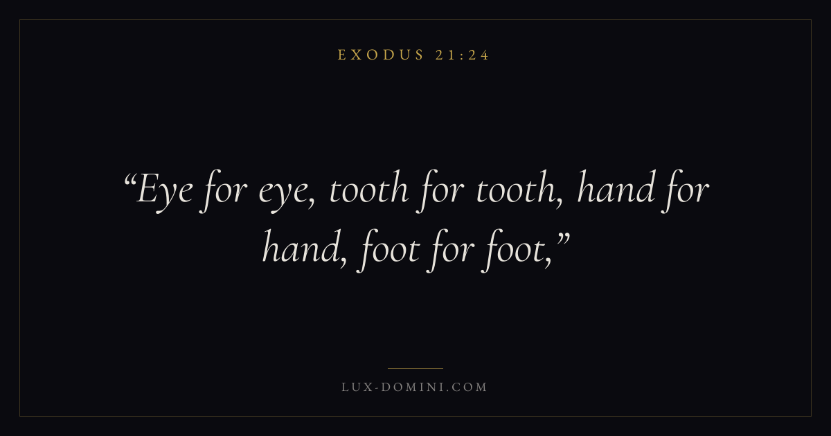 Books / Exodus / Chapter 21 / Verse 24 ← Exodus 21:23 Exodus 21:24 Exodus 21:25 → Eye for eye, tooth for tooth, hand for hand, foot for foot, Download verse card Share on Twitter Share on Facebook Pin it ✦ Key themes Anxiety and fearJustice and mercySalvationPeaceRedemption Read with Exodus 21:22Exodus 21:23Philippians 4:6Isaiah 41:10 Related topics Bible verses about anxiety and fearBible verses about justice and mercyBible verses about salvationBible verses about peace ✦ Exodus Chapter 21 verses V. 1 V. 2 V. 3 V. 4 V. 5 V. 6 V. 7 V. 8 V. 9 V. 10 V. 11 V. 12 V. 13 V. 14 V. 15 V. 16 V. 17 V. 18 V. 19 V. 20 V. 21 V. 22 V. 23 V. 24 V. 25 V. 26 V. 27 V. 28 V. 29 V. 30 V. 31 V. 32 V. 33 V. 34 V. 35 V. 36