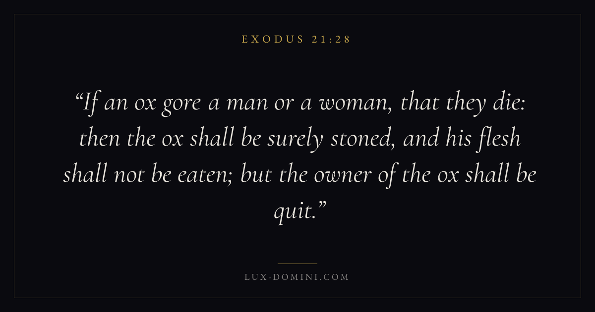 If an ox gore a man or a woman, that they die: then the ox shall be surely stoned, and his flesh shall not be eaten; but the owner of the ox shall be quit.