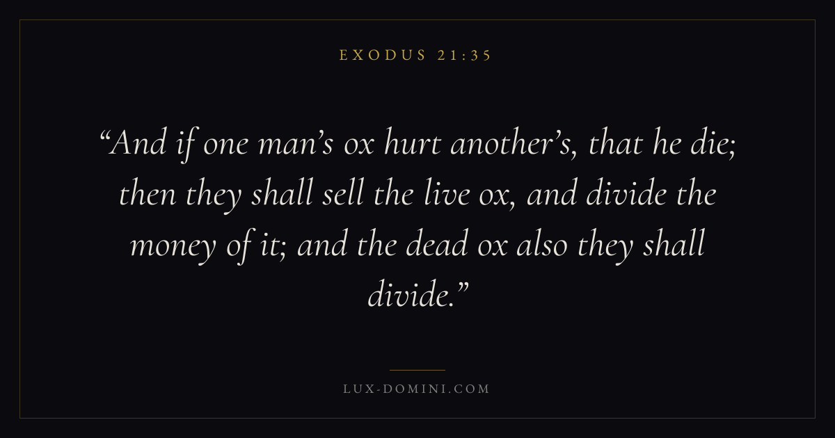 And if one man’s ox hurt another’s, that he die; then they shall sell the live ox, and divide the money of it; and the dead ox also they shall divide.