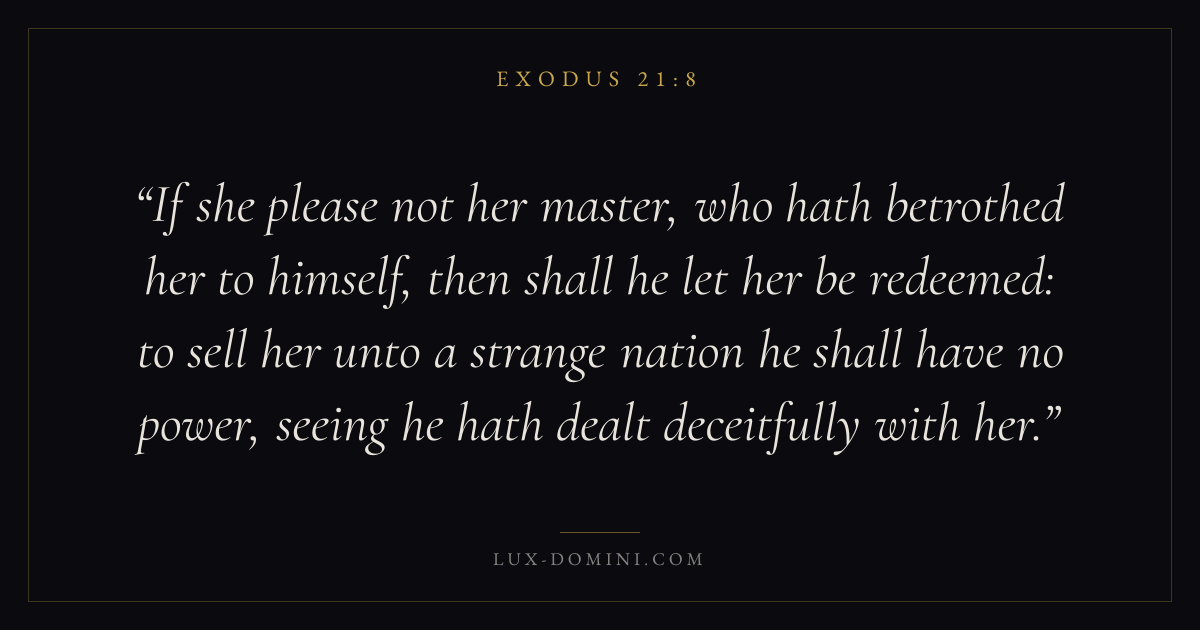 If she please not her master, who hath betrothed her to himself, then shall he let her be redeemed: to sell her unto a strange nation he shall have no power, seeing he hath dealt deceitfully with her.