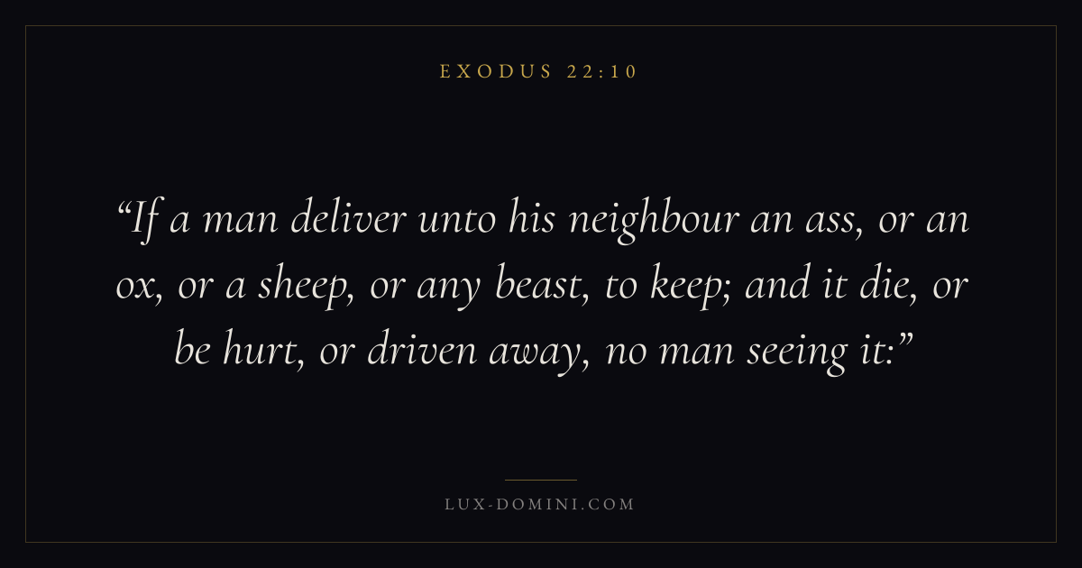 If a man deliver unto his neighbour an ass, or an ox, or a sheep, or any beast, to keep; and it die, or be hurt, or driven away, no man seeing it: