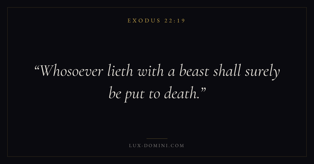 Books / Exodus / Chapter 22 / Verse 19 ← Exodus 22:18 Exodus 22:19 Exodus 22:20 → Whosoever lieth with a beast shall surely be put to death. Download verse card Share on Twitter Share on Facebook Pin it ✦ Key themes SalvationRedemptionPassoverCovenant Read with John 3:16Ephesians 2:8 Related topics Bible verses about salvation ✦ Exodus Chapter 22 verses V. 1 V. 2 V. 3 V. 4 V. 5 V. 6 V. 7 V. 8 V. 9 V. 10 V. 11 V. 12 V. 13 V. 14 V. 15 V. 16 V. 17 V. 18 V. 19 V. 20 V. 21 V. 22 V. 23 V. 24 V. 25 V. 26 V. 27 V. 28 V. 29 V. 30 V. 31