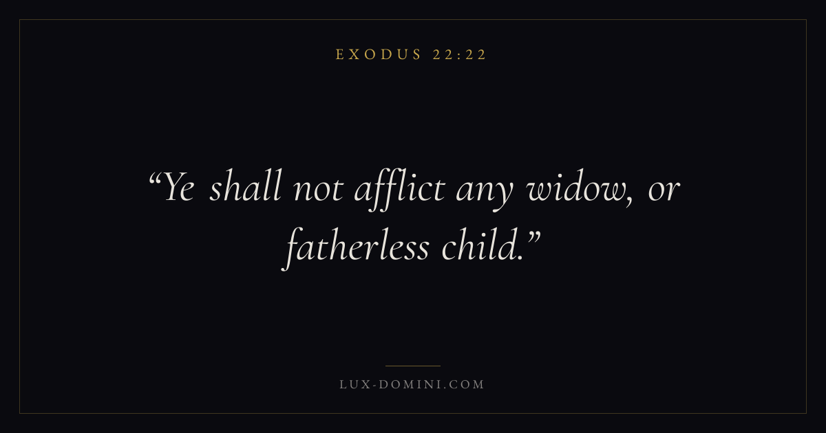 Books / Exodus / Chapter 22 / Verse 22 ← Exodus 22:21 Exodus 22:22 Exodus 22:23 → Ye shall not afflict any widow, or fatherless child. Download verse card Share on Twitter Share on Facebook Pin it ✦ Key themes Justice and mercySalvationRedemptionPassover Read with Exodus 22:23Exodus 22:24Micah 6:8Amos 5:24 Related topics Bible verses about justice and mercyBible verses about salvation ✦ Exodus Chapter 22 verses V. 1 V. 2 V. 3 V. 4 V. 5 V. 6 V. 7 V. 8 V. 9 V. 10 V. 11 V. 12 V. 13 V. 14 V. 15 V. 16 V. 17 V. 18 V. 19 V. 20 V. 21 V. 22 V. 23 V. 24 V. 25 V. 26 V. 27 V. 28 V. 29 V. 30 V. 31