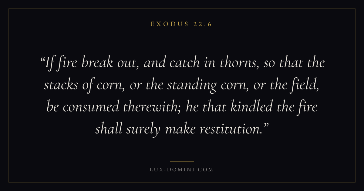 If fire break out, and catch in thorns, so that the stacks of corn, or the standing corn, or the field, be consumed therewith; he that kindled the fire shall surely make restitution.
