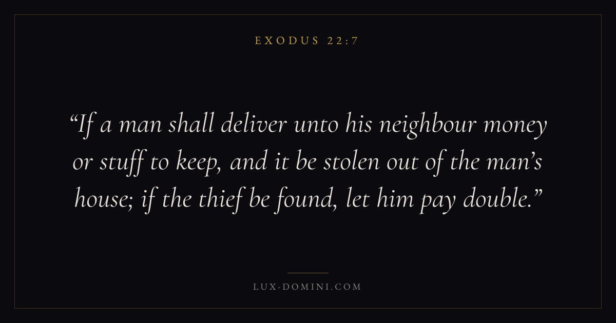 If a man shall deliver unto his neighbour money or stuff to keep, and it be stolen out of the man’s house; if the thief be found, let him pay double.