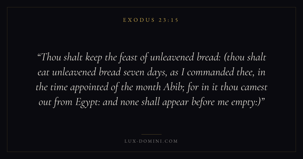 Thou shalt keep the feast of unleavened bread: (thou shalt eat unleavened bread seven days, as I commanded thee, in the time appointed of the month Abib; for in it thou camest out from Egypt: and none shall appear before me empty:)