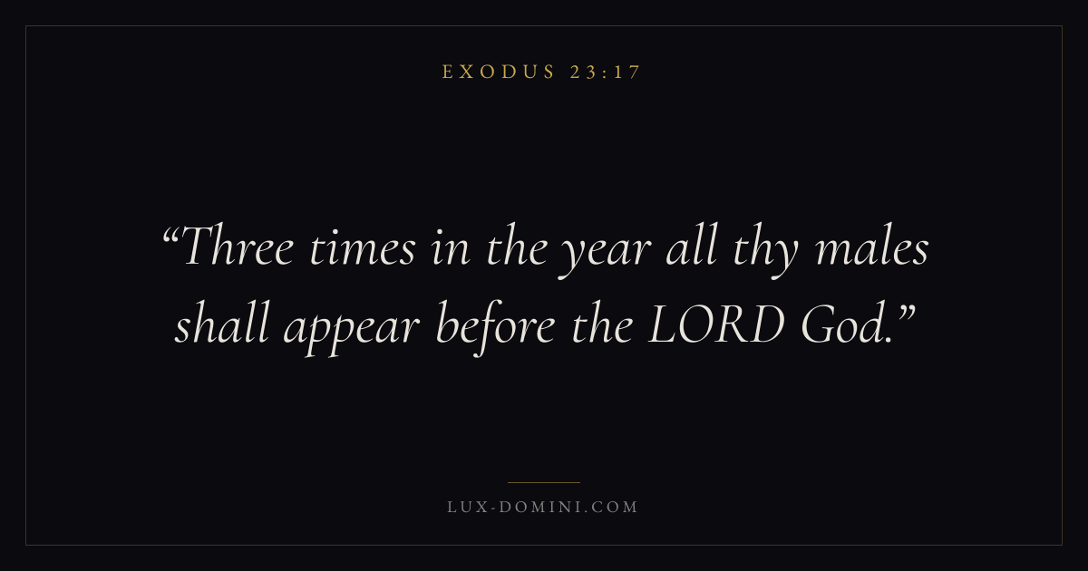 Books / Exodus / Chapter 23 / Verse 17 ← Exodus 23:16 Exodus 23:17 Exodus 23:18 → Three times in the year all thy males shall appear before the LORD God. Download verse card Share on Twitter Share on Facebook Pin it ✦ Key themes SalvationPeaceRedemptionPassover Read with Exodus 23:18Exodus 23:19John 3:16Ephesians 2:8 Related topics Bible verses about salvationBible verses about peace ✦ Exodus Chapter 23 verses V. 1 V. 2 V. 3 V. 4 V. 5 V. 6 V. 7 V. 8 V. 9 V. 10 V. 11 V. 12 V. 13 V. 14 V. 15 V. 16 V. 17 V. 18 V. 19 V. 20 V. 21 V. 22 V. 23 V. 24 V. 25 V. 26 V. 27 V. 28 V. 29 V. 30 V. 31 V. 32 V. 33