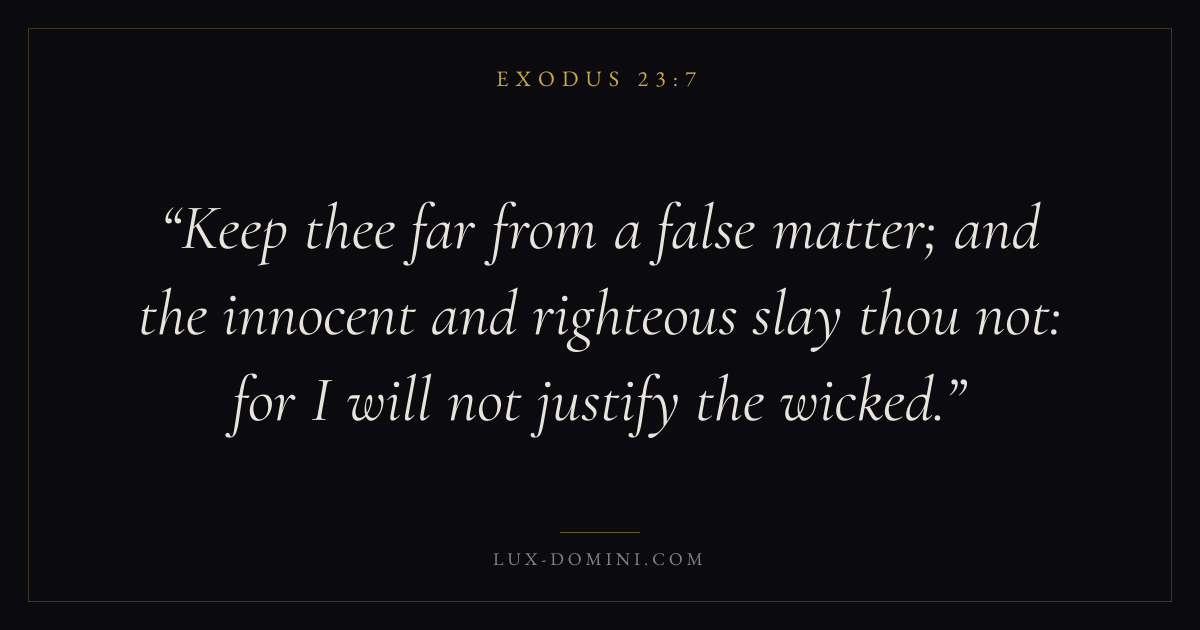Keep thee far from a false matter; and the innocent and righteous slay thou not: for I will not justify the wicked.