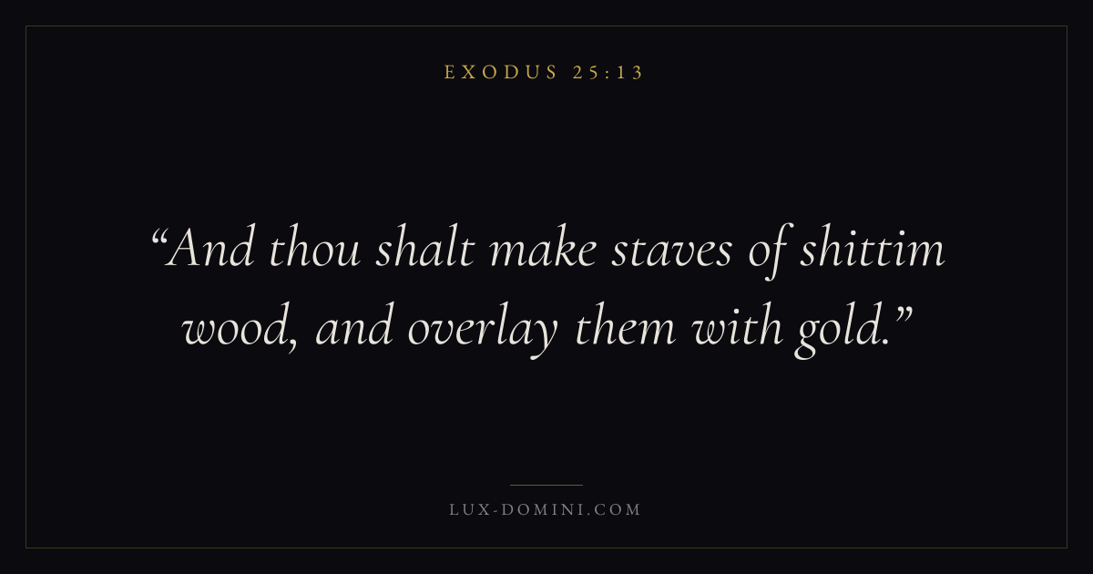 Books / Exodus / Chapter 25 / Verse 13 ← Exodus 25:12 Exodus 25:13 Exodus 25:14 → And thou shalt make staves of shittim wood, and overlay them with gold. Download verse card Share on Twitter Share on Facebook Pin it ✦ Key themes SalvationTruthRedemptionPassover Read with Exodus 25:10Exodus 25:11John 3:16Ephesians 2:8 Related topics Bible verses about salvationBible verses about truth ✦ Exodus Chapter 25 verses V. 1 V. 2 V. 3 V. 4 V. 5 V. 6 V. 7 V. 8 V. 9 V. 10 V. 11 V. 12 V. 13 V. 14 V. 15 V. 16 V. 17 V. 18 V. 19 V. 20 V. 21 V. 22 V. 23 V. 24 V. 25 V. 26 V. 27 V. 28 V. 29 V. 30 V. 31 V. 32 V. 33 V. 34 V. 35 V. 36 V. 37 V. 38 V. 39 V. 40