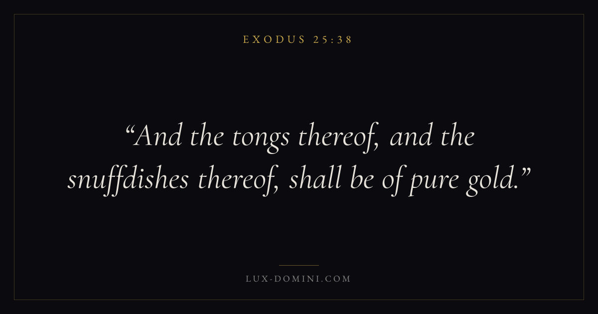 Books / Exodus / Chapter 25 / Verse 38 ← Exodus 25:37 Exodus 25:38 Exodus 25:39 → And the tongs thereof, and the snuffdishes thereof, shall be of pure gold. Download verse card Share on Twitter Share on Facebook Pin it ✦ Key themes SalvationTruthRedemptionPassover Read with Exodus 25:36Exodus 25:37John 3:16Ephesians 2:8 Related topics Bible verses about salvationBible verses about truth ✦ Exodus Chapter 25 verses V. 1 V. 2 V. 3 V. 4 V. 5 V. 6 V. 7 V. 8 V. 9 V. 10 V. 11 V. 12 V. 13 V. 14 V. 15 V. 16 V. 17 V. 18 V. 19 V. 20 V. 21 V. 22 V. 23 V. 24 V. 25 V. 26 V. 27 V. 28 V. 29 V. 30 V. 31 V. 32 V. 33 V. 34 V. 35 V. 36 V. 37 V. 38 V. 39 V. 40