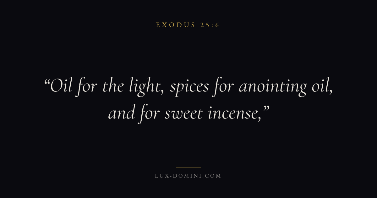 Books / Exodus / Chapter 25 / Verse 6 ← Exodus 25:5 Exodus 25:6 Exodus 25:7 → Oil for the light, spices for anointing oil, and for sweet incense, Download verse card Share on Twitter Share on Facebook Pin it ✦ Key themes SalvationRedemptionPassoverCovenant Read with Exodus 25:7Exodus 25:8John 3:16Ephesians 2:8 Related topics Bible verses about salvation ✦ Exodus Chapter 25 verses V. 1 V. 2 V. 3 V. 4 V. 5 V. 6 V. 7 V. 8 V. 9 V. 10 V. 11 V. 12 V. 13 V. 14 V. 15 V. 16 V. 17 V. 18 V. 19 V. 20 V. 21 V. 22 V. 23 V. 24 V. 25 V. 26 V. 27 V. 28 V. 29 V. 30 V. 31 V. 32 V. 33 V. 34 V. 35 V. 36 V. 37 V. 38 V. 39 V. 40