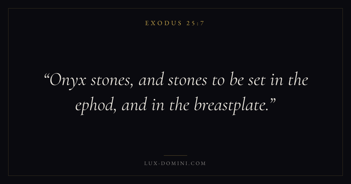 Books / Exodus / Chapter 25 / Verse 7 ← Exodus 25:6 Exodus 25:7 Exodus 25:8 → Onyx stones, and stones to be set in the ephod, and in the breastplate. Download verse card Share on Twitter Share on Facebook Pin it ✦ Key themes SalvationRedemptionPassoverCovenant Read with Exodus 25:6Exodus 25:8John 3:16Ephesians 2:8 Related topics Bible verses about salvation ✦ Exodus Chapter 25 verses V. 1 V. 2 V. 3 V. 4 V. 5 V. 6 V. 7 V. 8 V. 9 V. 10 V. 11 V. 12 V. 13 V. 14 V. 15 V. 16 V. 17 V. 18 V. 19 V. 20 V. 21 V. 22 V. 23 V. 24 V. 25 V. 26 V. 27 V. 28 V. 29 V. 30 V. 31 V. 32 V. 33 V. 34 V. 35 V. 36 V. 37 V. 38 V. 39 V. 40