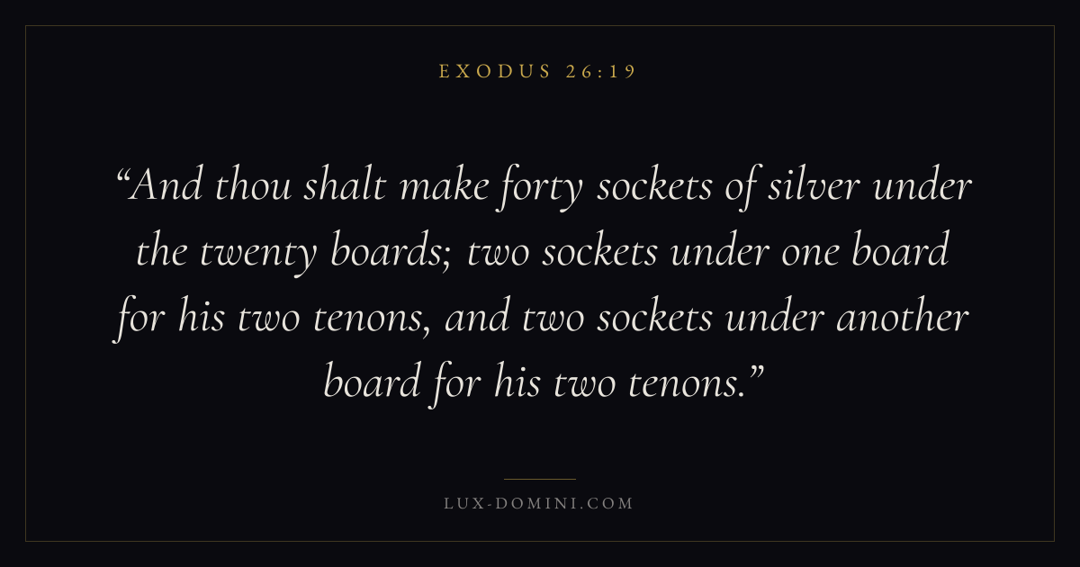 And thou shalt make forty sockets of silver under the twenty boards; two sockets under one board for his two tenons, and two sockets under another board for his two tenons.