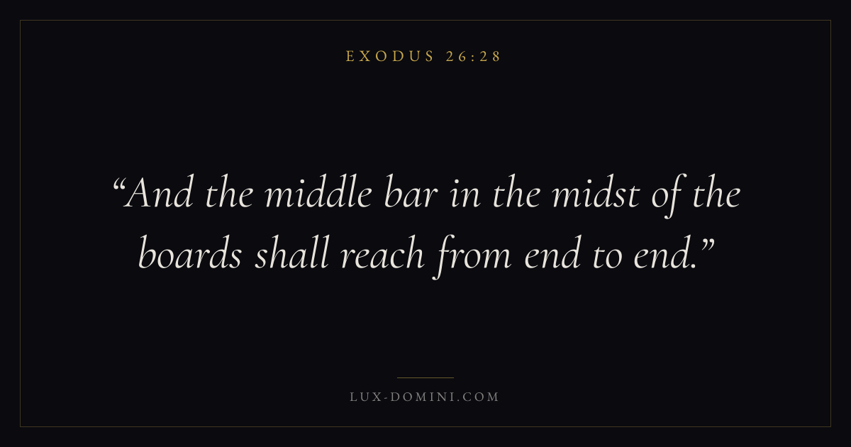 Books / Exodus / Chapter 26 / Verse 28 ← Exodus 26:27 Exodus 26:28 Exodus 26:29 → And the middle bar in the midst of the boards shall reach from end to end. Download verse card Share on Twitter Share on Facebook Pin it ✦ Key themes SalvationRedemptionPassoverCovenant Read with Exodus 26:26Exodus 26:27John 3:16Ephesians 2:8 Related topics Bible verses about salvation ✦ Exodus Chapter 26 verses V. 1 V. 2 V. 3 V. 4 V. 5 V. 6 V. 7 V. 8 V. 9 V. 10 V. 11 V. 12 V. 13 V. 14 V. 15 V. 16 V. 17 V. 18 V. 19 V. 20 V. 21 V. 22 V. 23 V. 24 V. 25 V. 26 V. 27 V. 28 V. 29 V. 30 V. 31 V. 32 V. 33 V. 34 V. 35 V. 36 V. 37