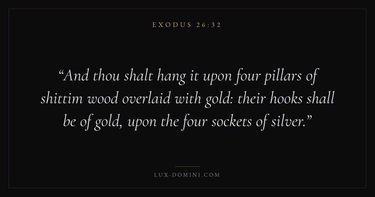 And thou shalt hang it upon four pillars of shittim wood overlaid with gold: their hooks shall be of gold, upon the four sockets of silver.