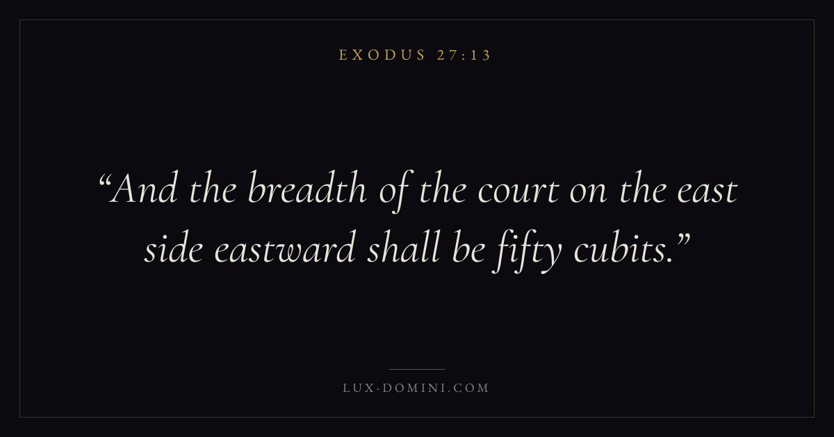 Books / Exodus / Chapter 27 / Verse 13 ← Exodus 27:12 Exodus 27:13 Exodus 27:14 → And the breadth of the court on the east side eastward shall be fifty cubits. Download verse card Share on Twitter Share on Facebook Pin it ✦ Key themes SalvationRedemptionPassoverCovenant Read with Exodus 27:12Exodus 27:14John 3:16Ephesians 2:8 Related topics Bible verses about salvation ✦ Exodus Chapter 27 verses V. 1 V. 2 V. 3 V. 4 V. 5 V. 6 V. 7 V. 8 V. 9 V. 10 V. 11 V. 12 V. 13 V. 14 V. 15 V. 16 V. 17 V. 18 V. 19 V. 20 V. 21