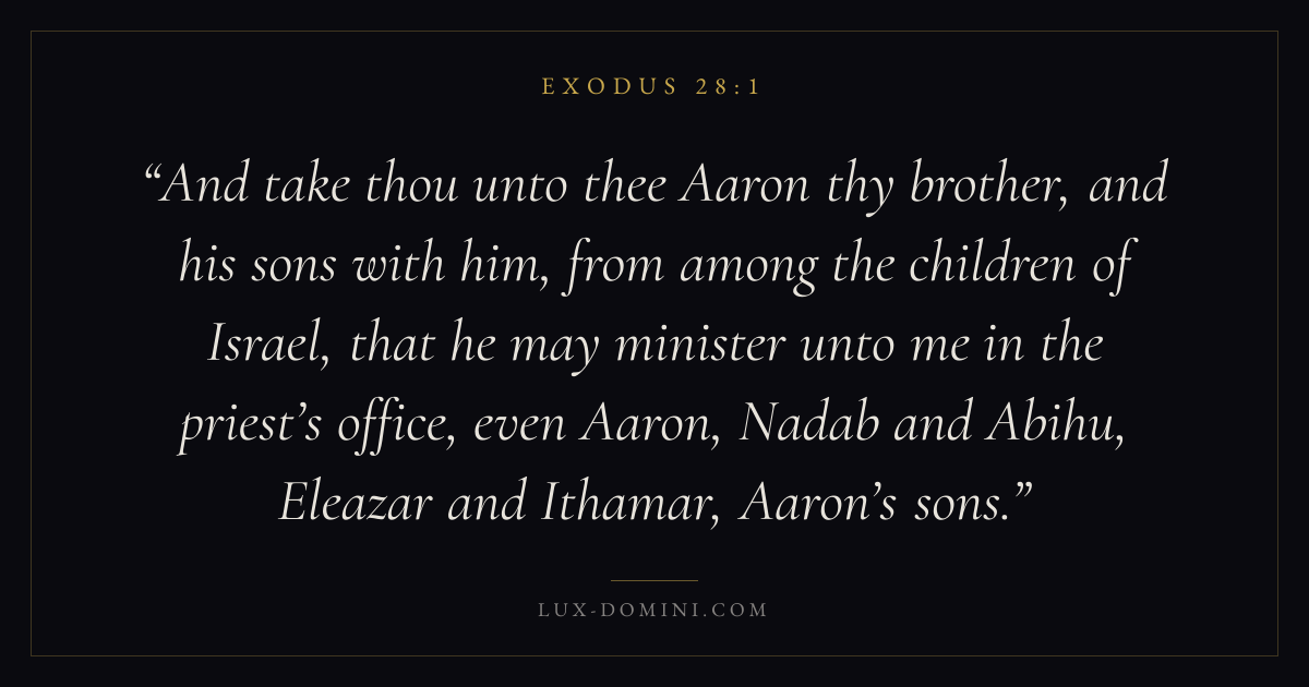 And take thou unto thee Aaron thy brother, and his sons with him, from among the children of Israel, that he may minister unto me in the priest’s office, even Aaron, Nadab and Abihu, Eleazar and Ithamar, Aaron’s sons.